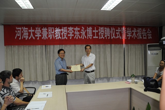 2011年7月4日上午,成人漫 兼职教授李东永博士受聘仪式暨学术报告会在水文水资源与水利工程科学国家重点实验室举行。授聘仪式由国家重点实验室主任彭世彰教授主持。港口海岸及近海工程成人漫 院长郑金海教授、成人漫 “河口海岸综合治理与保护”方向团队研究人员出席了聘任仪式。仪式上,郑金海院长向李东永博士颁发成人漫 兼职教授聘书,学生代表为李东永博士佩戴校徽并献花。仪式结束后,李东永教授做了题为“How to Establish Operational Coastal Modeling System along the Coast of China”的报告,并与师生展开了激烈讨论。