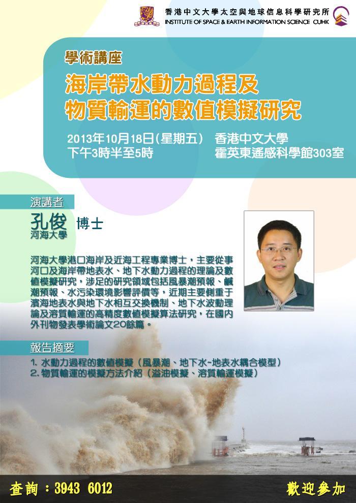 2013年10月18日,成人漫孔俊副教授应香港中文大学太空与地球信息科学研究所邀请,在香港中文大学开展学术讲座《海岸带水动力过程及物质输运的数值模拟研究》。孔俊副教授长期从事河口及海岸带地表水、地下水动力过程的理论及数值模拟研究,涉足的研究领域包括风暴潮预报、咸潮预报、水污染环境影响评价等,近年来侧重于滨海地表水与地下水相互交换机制、地下水波动理论及水体中污染物输运的高精度数值算法研究,在国内外刊物发表学术论文20余篇。本次讲座,孔俊副教授对其近年来提出的高精度物质输运模拟算法“A High-resolution method for the depth-integrated solute transport equation based on an unstructured mesh”和地表水—地下水整体模型“A new model for coupling surface and subsurface water flows: With an application to a lagoon” 进行了宣讲,并与中大科研人员就下阶段的合作进行了深入交流。