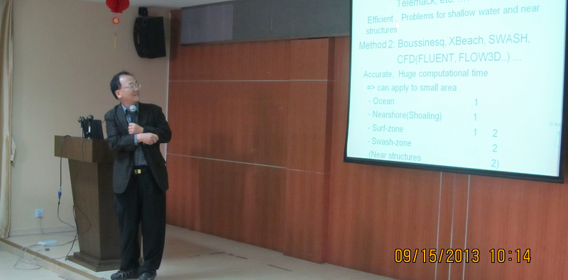 2013年11月15日上午,麻省大学陈长胜教授和韩国海洋研究所首席科学家Dong-Young Lee教授应邀来成人漫作学术报告。报告在严恺馆702进行,会上两位教授分别作了题为“Tsunami, Coastal Inundation and Radionuclide Spreading”、“Strategic Approach to Some Coastal Engineering Problems in the Yellow Sea and East China Sea”的学术报告,报告会由成人漫陈达副院长主持。