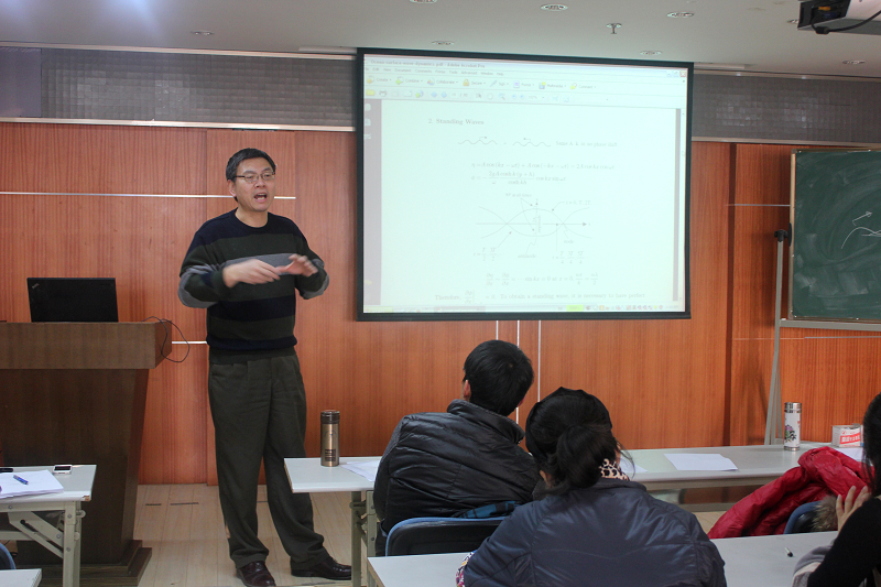 在教学环节,刘老师采用MIT原版教材为成人漫 在读博士和部分年轻教师系统讲授了“高等海岸动力学”和“港口、海岸及近海工程前沿专题讲座”两门博士学位课程中有关高等水波动力学的部分。讲课内容分为三部分,一是线性波及其与建筑物的相互作用,二是经典非线性波浪理论及其应用方法,三是波浪与建筑物相互作用问题的数值求解方法。刘老师一再强调他授课的两个主要目标,一是重新理解最简单的基础,他想让大家理解水波的基本问题,掌握最基本的推导方法和研究思路;二是真正领悟科学研究思路的连续性,他想让大家知道前沿问题的解决均源自这些基本问题,且通过所讲基本方法的熟悉运动都可以有所突破。期间翔实丰富的课程讲义,详尽清晰的板书推导,深入浅出的娓娓讲述,朴实准确的学术用语,让所有的听课人都觉得受益匪浅。