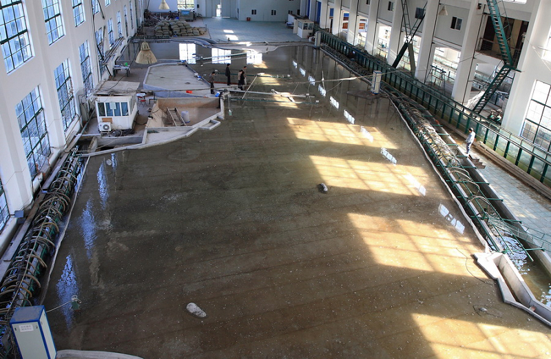 该系统由多个32通道开边界模型多泵控制柜、数百个小型潜水泵、水位和流速量测设备、工控计算机和测控软件等组成,成人漫自行研制。潮流模型试验中计算机控制模型边界上布设的每一台的小型水泵(流量预先标定)的运行,能准确模拟开边界海域复杂潮流场的流速大小、流向、潮位变化过程,结合移动式不规则波造波机、泥沙测控系统等设备,可进行模拟波浪、潮流、泥沙共同作用的整体物理模型试验。