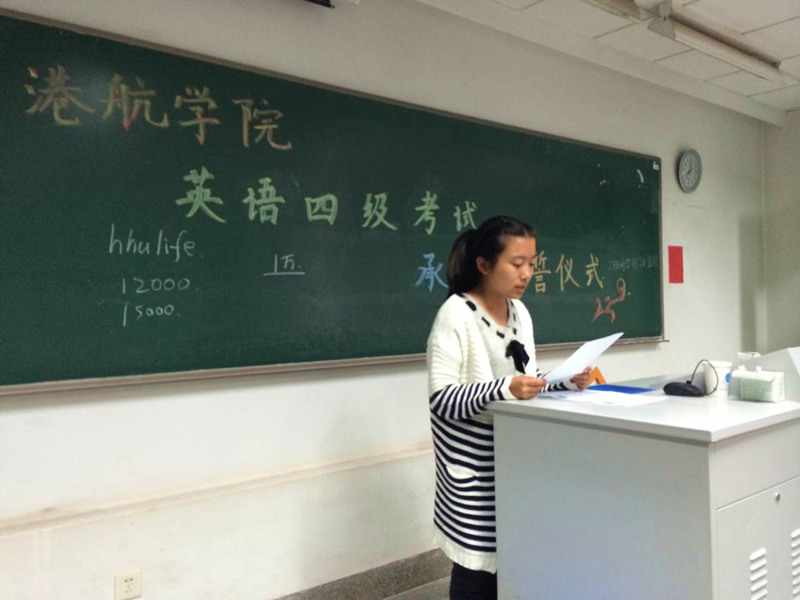 为了督促同学们认真准备即将到来的英语四六级考试,引导同学们诚信考试、抵制作弊念想,2014年10月14日晚,港航专业与海洋专业的同学分别在致用楼319以及致用楼206教室举行了“考前承诺”宣誓仪式。