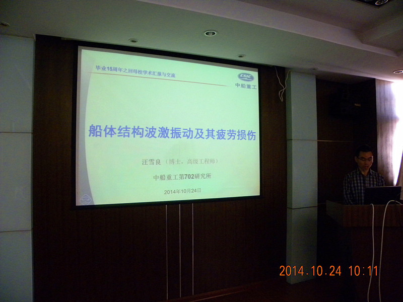 2014年10月24日上午,成人漫 兼职教授汪雪良博士受聘仪式暨学术报告会在成人漫 严恺馆502举行。授聘仪式由成人漫 院长郑金海教授主持。成人漫 副院长诸裕良教授主持了学术报告会,院长助理张继生教授及众多师生出席了仪式。仪式上,郑金海院长向汪雪良博士颁发了成人漫 兼职教授聘书,学生代表为汪雪良博士佩戴校徽。仪式结束后,汪雪良博士做了题为“船体结构波激振动及其疲劳损伤”的报告,并与师生展开了热烈讨论。