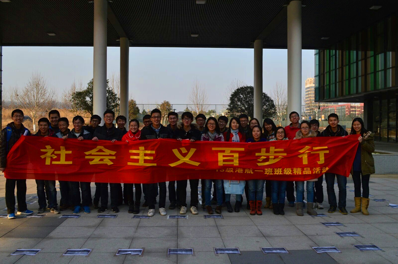 2014年12月29日,2013级港航1班在江宁文体中心前开展了“社会主义百步行”答题大富翁的活动,该活动是成人漫 支持的班级精品活动,积极响应了“我为社会主义核心价值观代言”的号召,港航1班全体同学和辅导员赵倩老师都参与其中。