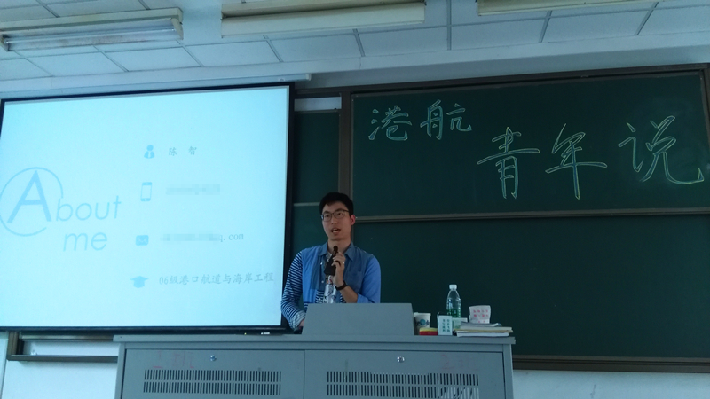 5月13日下午4点,港航院优秀毕业生、原港航院2010级本科生辅导员、现校团委陈智老师作为本次“港航青年说”的嘉宾于致用楼217教室与港航院的同学们分享了他的大学经历和学习、生活经验,同时作为学长,也给了学弟学妹们很多指导和建议。参加此次活动的有港航院大一、大二的同学,两位辅导员王玲老师和季超老师也参加了此次分享会。