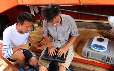 7月22日凌晨2点,实践团跟随李欢老师从盐城死生港出海采样。到达指定海域后,大家等待海水退潮,然后再下船进行采样。在9点30分进行第一次采样,之后每隔半小时采样一次,共采样5次。在开始采样之前,队员们再一次体验了军训似的生活,在泥滩中站立数小时等待第一次采样。整个采样过程耗时5、6个小时,期间队员们都一直坚持在各自的采集点,不敢有丝毫懈怠。
