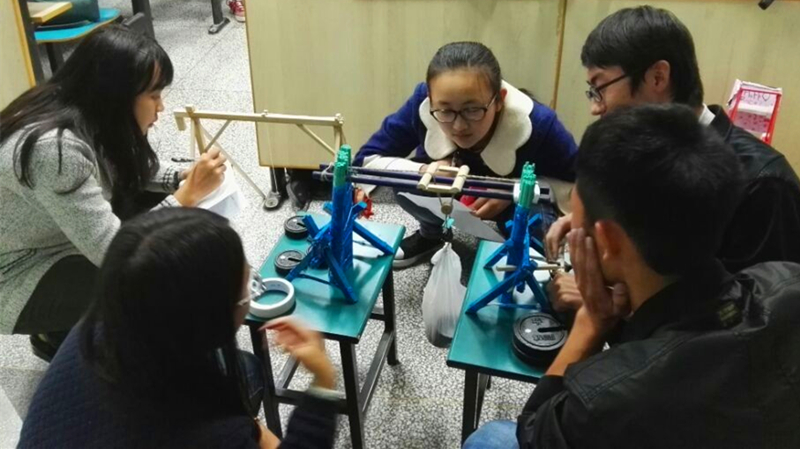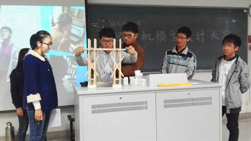 两点半,比赛正式开始,各组选手依次走上讲台,讲述自己的创意思路。从选手们极富感染力的答辩中可以看出,每一位选手都为自己的模型付出了无数的心血,经过巧妙的设计构思和数次的推翻重来,将模型从最初的雏形,渐渐磨砺出最后的佳作。 其中最值得称道的是大禹院王旭组的作品, ppt上列出的物理公式及现场实践的结果令同学们钦佩他们的缜密。港航院孙彩淦组的作品也毫不逊色。细节处十分精密,缝隙连接处堪称完美。