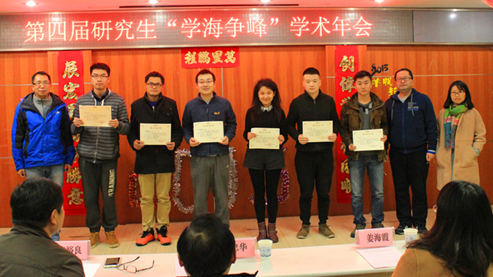 会议首先由胡忠华书记致辞。胡忠华书记在高度肯定此次学术年会价值的同时,总结了本次活动的四个特点:1、参与率高;2、学术水平高;3、利用新媒体宣传程度高;4、导师重视程度高。同时也对每位研究生提出了自己的四点希望:希望我们发扬急流争锋的超越精神;希望我们发扬“献身、负责、求实”的水利精神;希望我们发扬敢于创新、敢于批评的科学精神;希望我们发扬相互交流的协作精神。随后诸裕良副院长公布获奖名单。宣布一等奖4名,二等奖6名,三等奖8名,19位优秀报告人以及1个最佳人气奖和1个最佳报告奖。紧接着由参加本次闭幕式活动的领导和老师们给获奖选手颁奖,并合影留念。最后,胡忠华书记宣布本届“学海争峰”学术年会闭幕。