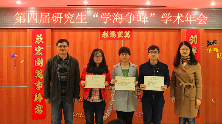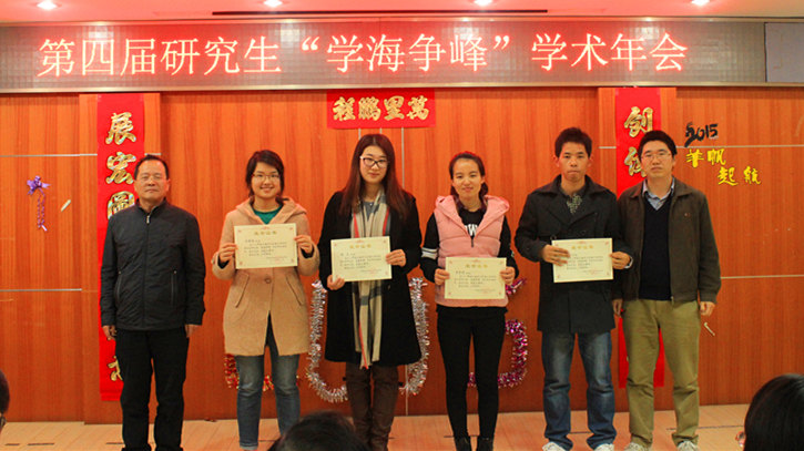 会议首先由胡忠华书记致辞。胡忠华书记在高度肯定此次学术年会价值的同时,总结了本次活动的四个特点:1、参与率高;2、学术水平高;3、利用新媒体宣传程度高;4、导师重视程度高。同时也对每位研究生提出了自己的四点希望:希望我们发扬急流争锋的超越精神;希望我们发扬“献身、负责、求实”的水利精神;希望我们发扬敢于创新、敢于批评的科学精神;希望我们发扬相互交流的协作精神。随后诸裕良副院长公布获奖名单。宣布一等奖4名,二等奖6名,三等奖8名,19位优秀报告人以及1个最佳人气奖和1个最佳报告奖。紧接着由参加本次闭幕式活动的领导和老师们给获奖选手颁奖,并合影留念。最后,胡忠华书记宣布本届“学海争峰”学术年会闭幕。