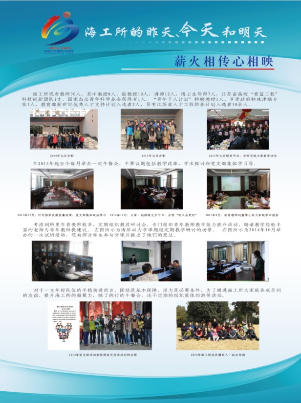 2015年10月25日至31日,成人漫 海工党支部在成人漫 校党委组织部和成人漫 党委的共同支持下,举办了主题为“海工的昨天、今天和明天”的文化展活动。展览过程中,除了海工党支部全体党员专门组织了观展和学习活动外,学校的师生员工以及校庆期间返校的校友们等约三百余人次参与了该活动。本次展览活动旨在通过对海工辉煌历史的梳理,提升海工所全体教师的集体荣誉感;通过对海工文化精神的凝练,实现海工精神的传承与可持续发展;通过对海工过去成绩、现在工作以及未来愿景的展示,促进海工人的自我认可,树立着海工精神在全院以及全校文化建设中的模范形象。