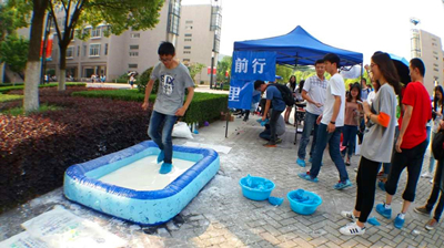 当天最吸引人的就非“非牛顿流体”莫属了。当你通过时,如果速度足够快,这流体将会变成“固体”给你足够的支持力,如果你不能达到某一速度,将会可怕地陷下去。在本关负责人于晓辉的介绍与示范下,同学们先是表示疑问,用手拍打进行尝试,后来越来越多的人穿上鞋套进行挑战。通过了的同学表示真是神奇,没有通过的同学即使被黏住了脚,也是满脸笑意,因为他们不仅挑战了自己,也认识到了水力学知识的力量。