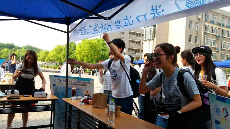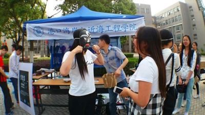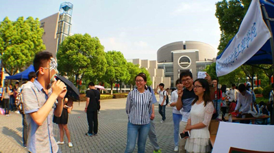 通过任何一关的同学便可获得奖励——体验高科技“VR”。带上VR眼镜的你会仿佛瞬间置身于另外一个空间,并且依旧可以随着你的走动旋转而改变视角,体验全方位的虚拟世界。工作人员提前准备了可以全方位参观侏罗纪公园的历史体验、可以挑战自我虚拟坐过山车的高度体验、让你身处鬼屋寻找出路的恐怖体验等等。在体验负责人赖颖的介绍下,同学们无一不表示惊奇。有因为害怕大叫出声的女生同学,有因为感兴趣想研究原理的计信院同学,还有因为非凡体验想将同学们的眼镜买回去看电影的同学。本次的体验让参与的同学感觉到了人类感官的重要性以及认识到了在全身心置于另一场所所表现出来的真实自己。