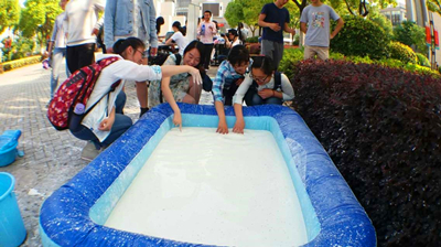 当天最吸引人的就非“非牛顿流体”莫属了。当你通过时,如果速度足够快,这流体将会变成“固体”给你足够的支持力,如果你不能达到某一速度,将会可怕地陷下去。在本关负责人于晓辉的介绍与示范下,同学们先是表示疑问,用手拍打进行尝试,后来越来越多的人穿上鞋套进行挑战。通过了的同学表示真是神奇,没有通过的同学即使被黏住了脚,也是满脸笑意,因为他们不仅挑战了自己,也认识到了水力学知识的力量。