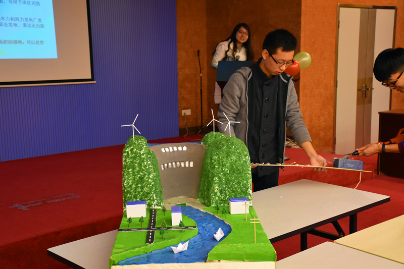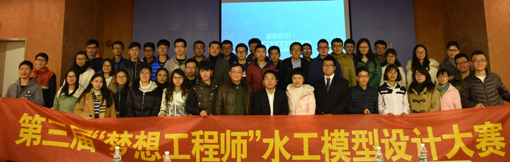 决赛开始,主持人介绍评委老师及决赛流程,选手们按照抽签顺序依次走上讲台,结合ppt介绍与实物模型展示,向评委们介绍模型的设计理念、制作过程和作品特色。“梦想工程师”们的“梦想模型”形式多样:局部的码头、大坝、船舶升降机;全景的海港、大坝;以低碳环保、生态和谐为主题的未来大港规划等等。其中,来自港航院同学制作的“低碳节能、梦筑绿港”模型演示出风力、潮汐为设备供电、使船体发出声音的过程。而大禹院的同学制作的空腹重力坝也很吸引评委的眼球,该组模型预设在河流湍急、河道狭窄以及山势险峻的恶劣地形下,对比分析了实体重力和宽缝重力坝,不仅克服了两者的不足,还有节约用料、承重抗压、利于环保等优点。此外,还有将音乐厅与潮汐结合的模型,细节部分精雕细刻,堪称艺术……每组选手介绍完,评委老师都就模型的设计展开点评,提出自己的建议。六点半,参赛选手介绍完毕,丁坚老师走上讲台分享自己对科研的见解,肯定同学们的学习热情和成果,并鼓励同学们学以致用,学有所思,在科学研究的舞台上展示自我。全体人员合影留念后,第三届“梦想工程师”水工模型设计大赛圆满结束。