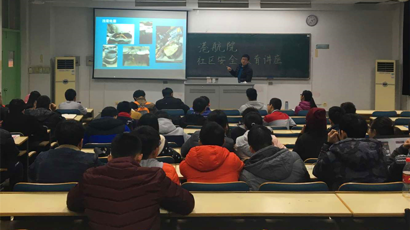 薛书冰老师以当下“温馨时髦”宿舍标配“电饭煲”、“电热毯”等大功率电器频频出现的现象,指出同学们安全用电意识的缺乏。薛老师结合具体事例,比如阿姨查房,藏起正在煮的火锅等,生动形象地向大家描述了使用这些电器的同学们对于防范阿姨的种种措施。接着薛书冰老师向大家详细讲解了使用这些违章电器造成的后果:小则造成财产损失,大则威胁生命安全。港航院同学听完之后,对自己在宿舍的相关用电行为进行了一番反思。期间,薛书冰老师援引了以前学生宿舍发生的实例,为同学们敲响了警钟。并呼吁大家自觉抵制违章电器的使用,对个人、对他人生命负责,共同维护宿舍安全。