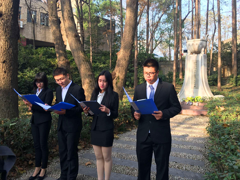 上午九点,同学们准时来到纪念碑下,活动在新生代表王褀的主持下正式展开。在简短的开场白后,李怡玮、吴琦等四位同学上前满怀深情地朗诵了《南京,我们没有忘记》这一诗篇,不过顷刻,悲声大作。朗诵完毕,同学们驻足在纪念碑前全体默哀三分钟,至此仪式结束。