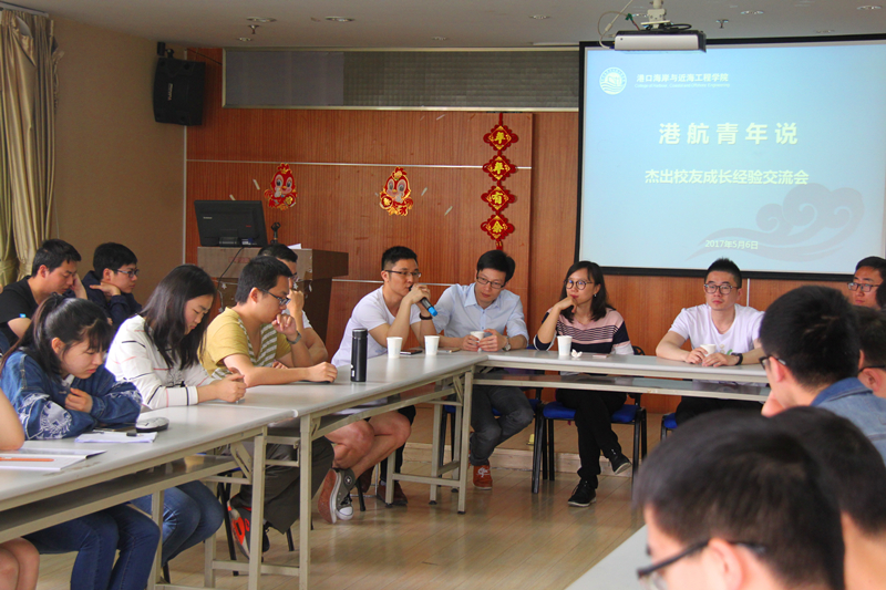 活动中,郑征学姐首先为大家介绍了港航专业毕业后的去向;从事管理工作的张运东学长分析了港航专业未来的发展前景;毕业后留校读研的郑国诞学长目前就业于浙江省水利河口研究院,他向同学们强调了大学课程学习的重要性,因为这些课程知识是从事科研工作的基础;在施工单位工作的毕洪武学长告诉大家要做好规划,并强调了工作前五年的重要性。在与同学的交流中,学长学姐们都强调了读书的重要性,强调要利用好大学的时间,提升自身能力,用更宽广的视角来看待世界。
