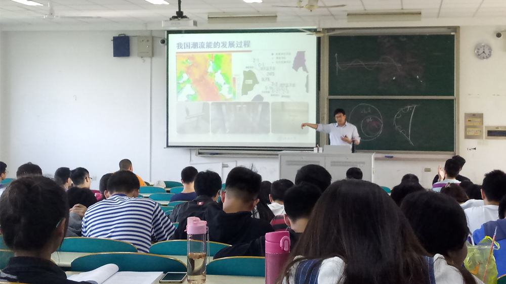 接着,讲座进入了主题,张老师指出:海洋占地球表面积的71%,资源丰富,开发潜力巨大——共有5种海洋动力,包括潮汐、潮流、波浪、温差和盐差;它们分别对应5种海洋能,包括潮汐能、潮流能、波浪能、温差能和盐差能;这些海洋能的共同特点是可再生、绿色清洁、蕴藏量大。随后,老师针对这些海洋能各自的特征特性、研发历程和优势劣势三个方面有条不紊地给同学们进行科普。讲座最后,张老师还就海洋能整体发展趋势给大家做了总结。