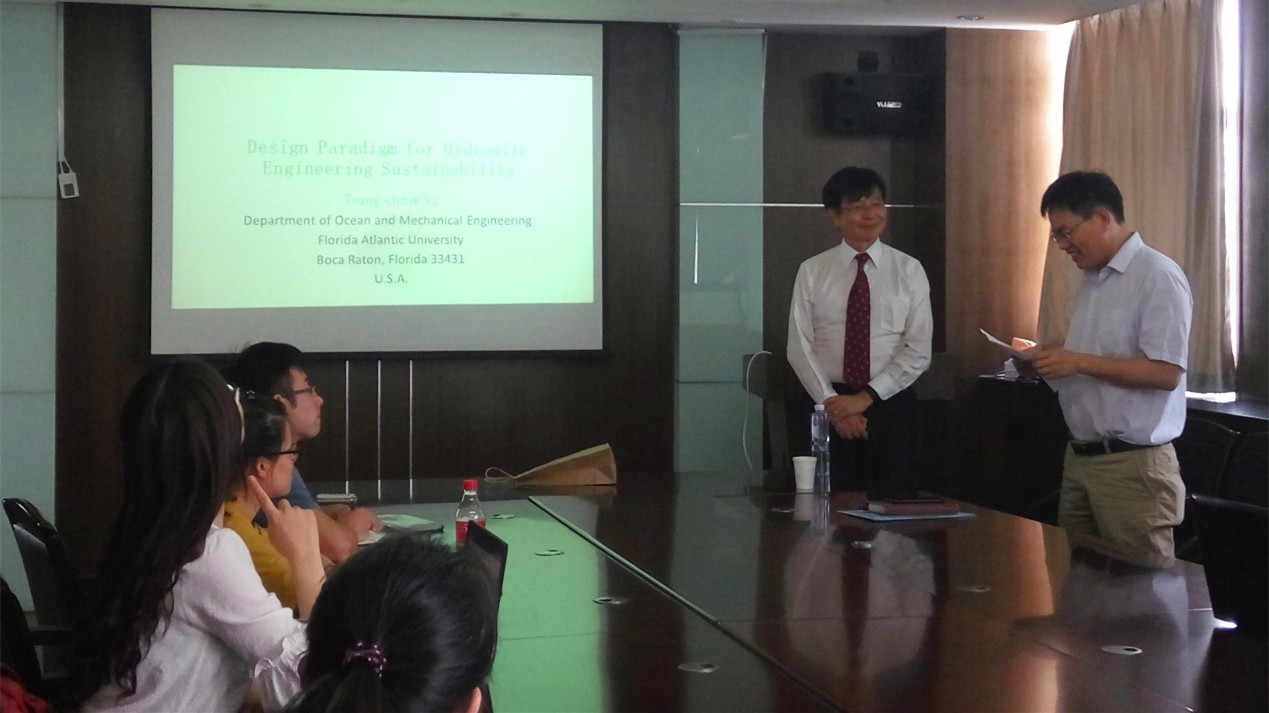 上午,苏教授和谢副教授在黄挺老师带领下先后参观了水文水资源与水利工程科学国家重点实验室和成人漫港口航道工程与海岸海洋科学实验中心。下午,苏教授在严恺馆会议室做了题为“Design Paradigm for Hydraulic Engineering Sustainability”的学术报告,针对流固耦合、泥沙输运以及工程冲刷防护等问题,介绍了水利工程结构的永续性设计及优化研究。苏教授从中国古代哲学的视角出发,揭示了众多问题复杂表象后的核心实质和解决方案,传递了“大道至简”的科研理念,为参会人员开展科研工作带来了新颖的思路,引发了热烈地交流与探讨。会议由副院长张继生教授主持,来自港航院和水文院的20多位师生参加。