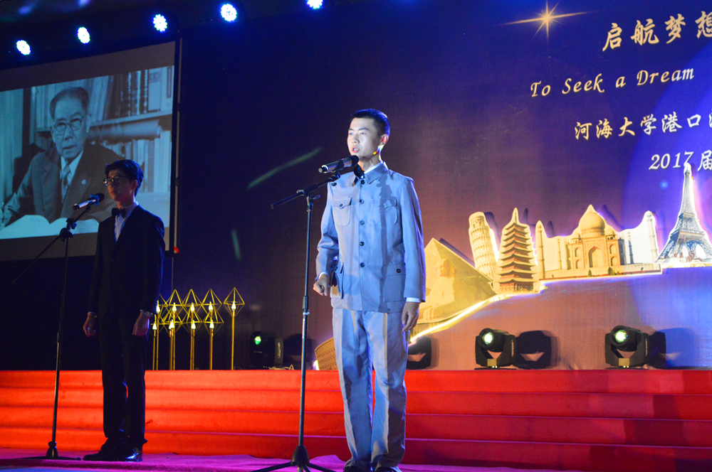 晚会的主题是“启航梦想,对话世界”,一开场,晚会的世界著名建筑物背景和主持人流利的中英双语开场顿时让整个晚会充满了国际范儿。随后,精彩的节目也让人拍手叫绝、意犹未尽。研究生们活力四射的啦啦操和曼妙的拉丁舞表演、蒋勤老师的美声独唱、本科生们的爆笑小品和精彩歌舞,以及班导师、辅导员振奋人心的诗朗诵,还有海洋成人漫