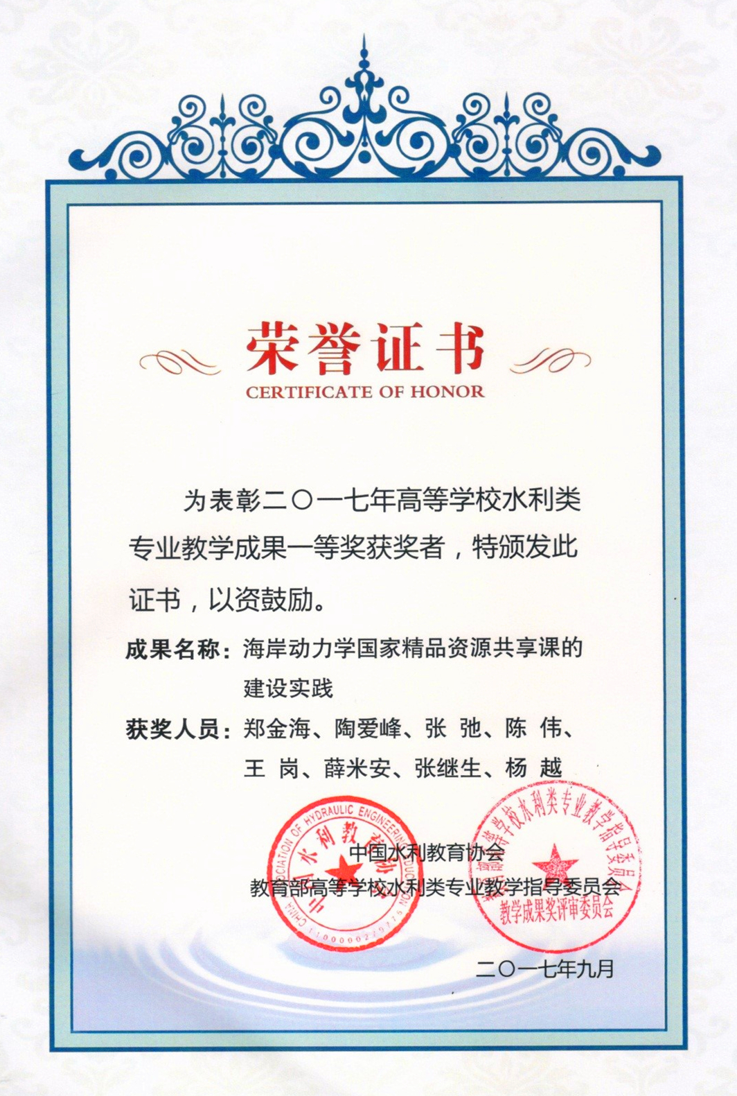成人漫郑金海、陶爱峰、张弛、陈伟、王岗、薛米安、张继生和杨越老师联合申报的教学成果“海岸动力学国家精品资源共享课的建设实践”获2017年度高等学校水利类专业教学成果奖一等奖。
