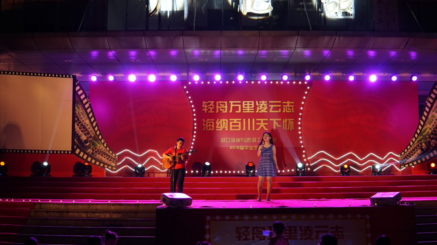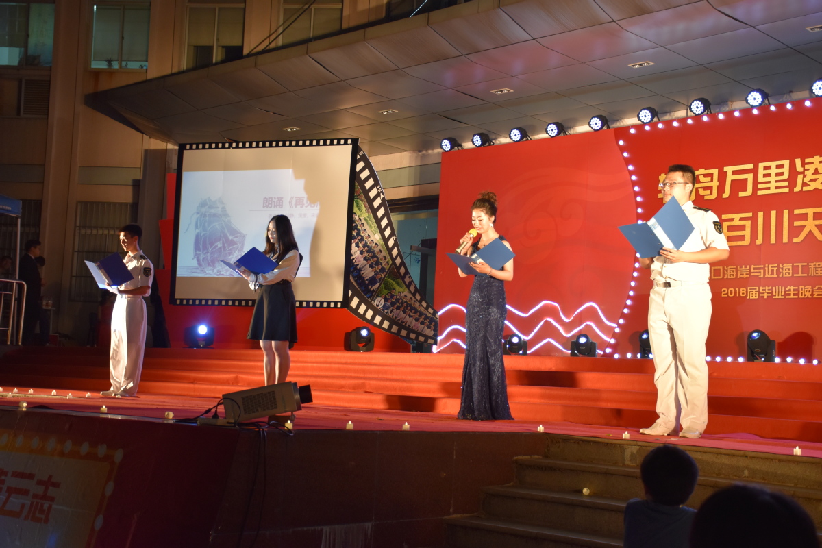 扬凌云壮志,引吭高歌,一路欢笑。一曲由2014级港航国防生集体组织的《国防生大合唱》让同学们体会到当代男儿保家卫国的责任和担当。《HHU港航晚间新闻》给大家带来欢笑的同时,也旨在号召同学们多关注祖国港航事业的未来。随后,尹璐、林欣然带来的吉他弹唱《不为谁而作的歌》,希望同学们能够聆听内心,凝聚起身边老师朋友的支持力量。港航2班四人合作的诗朗诵《再见河海》,将对母校的深深祝福埋藏在诗一般的话语中。