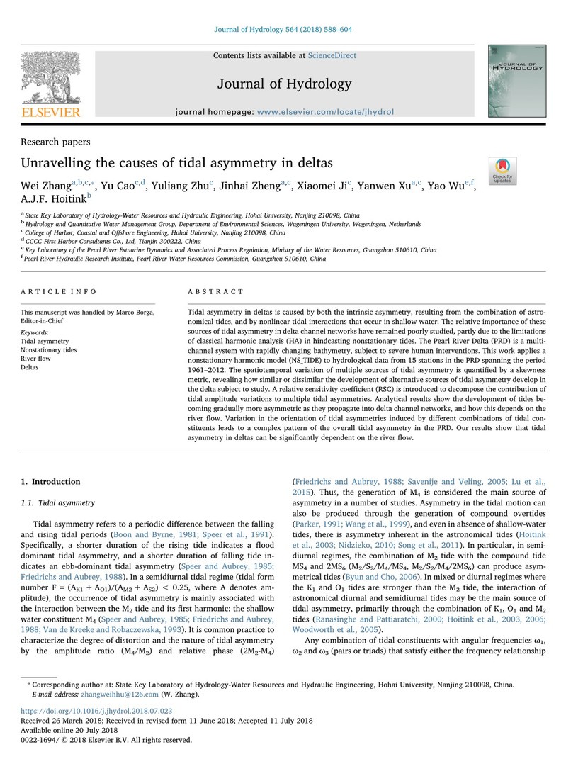 近日,国际权威期刊《Journal of Hydrology》(影响因子:3.73)发表海工所张蔚教授团队最新研究成果“Unravelling the causes of tidal asymmetry deltas”。