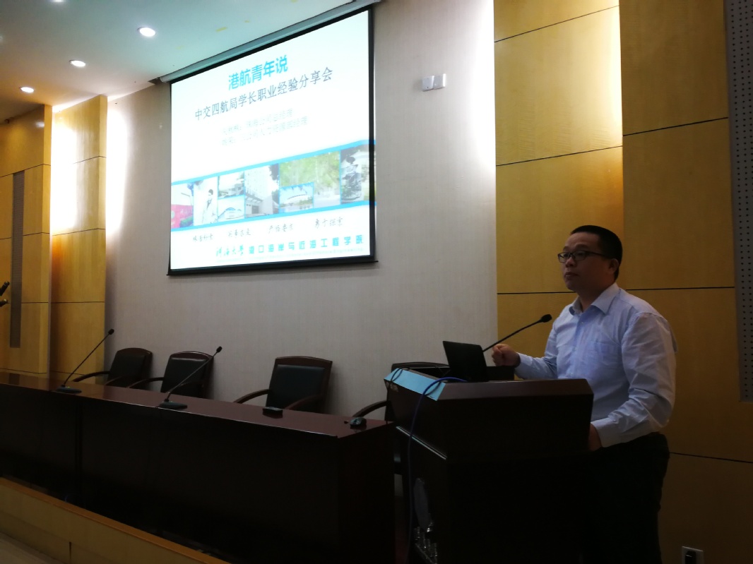 首先进行交流的是珠海公司总经理关秋枫。关经理从“一线做起,夯实基本功”,“技术人才向项目管理者过渡”,“学以致用,回报社会”三个方面全面向同学剖析了自己的工作经历,并给同学们提出了主动适应、融入团队,加强学习、创新发展,实干高效、勇于担当三点工作建议。随后,来自三公司的人力资源部经理姚荣,从学生的角度出发,结合自身工作经历,与同学分享自己的工作心得和职业生涯规划经验。分享会结束后,四航局在现场进行了招聘活动,为有意向的同学提供了很好的工作岗位。
