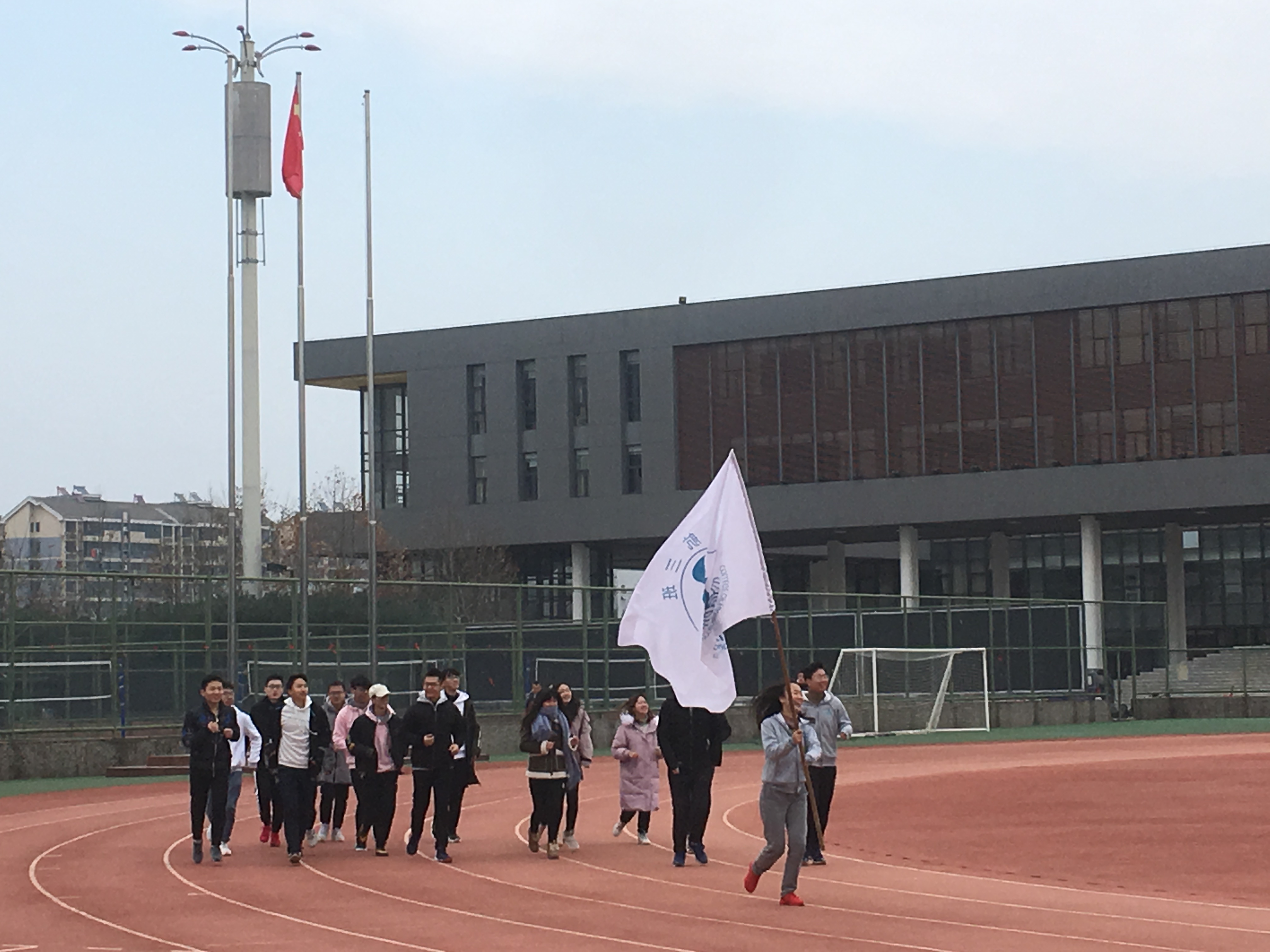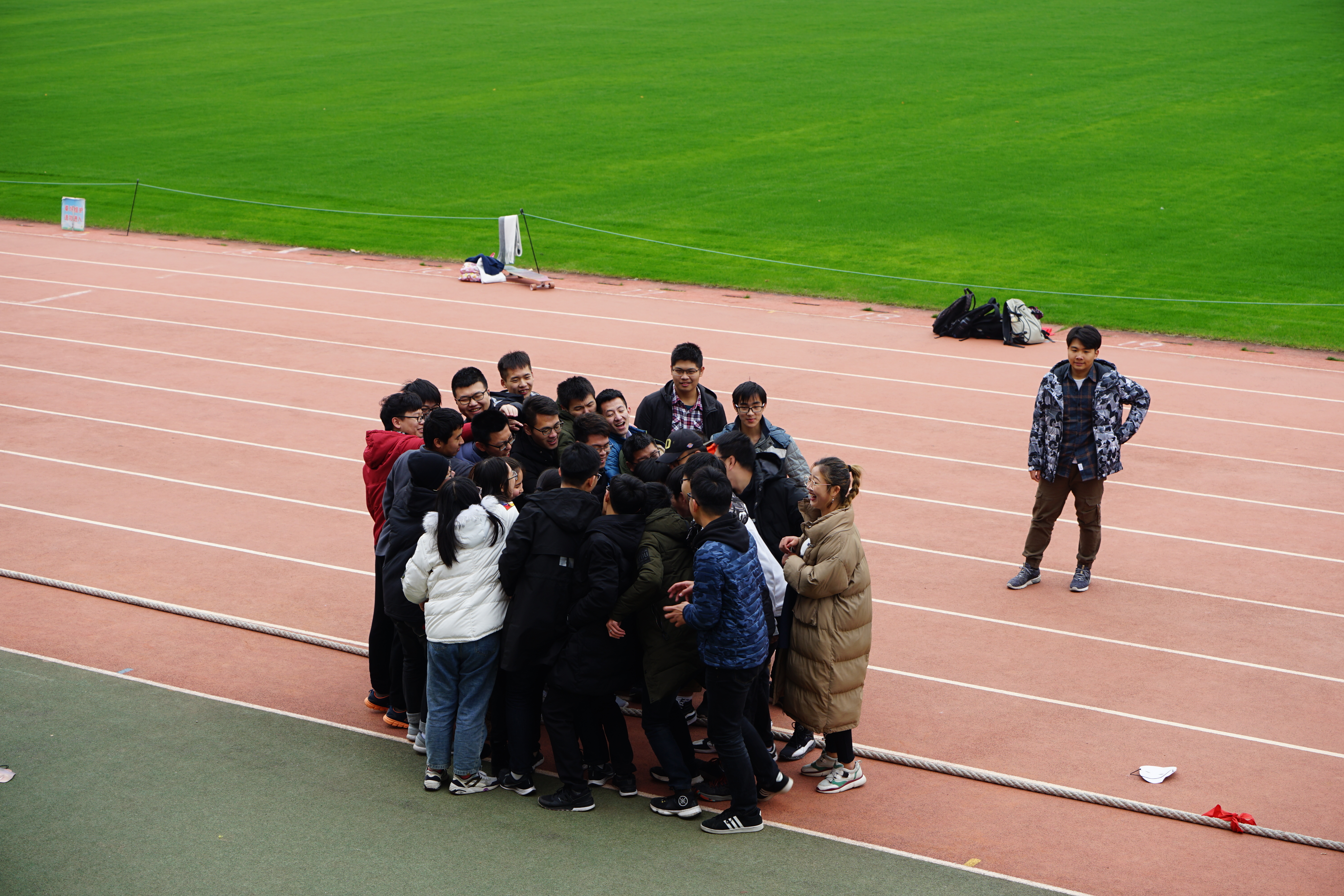 开赛前,同学们早早的来到东操进行准备和热身运动。他们以班级为单位,有的聚集在一起讨论战术,有的在观众席绑上了自己班的横幅,有的扛起班旗、绕跑操场,进行赛前热身。同学们的班级集体荣誉感,赋予了这场拔河比赛充足的热情与仪式感。