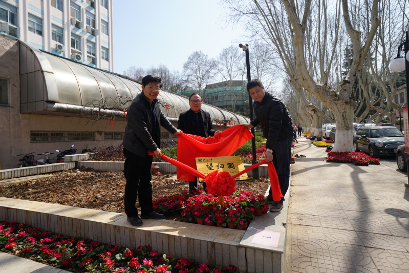 在“开工第一铲”仪式中,郭祥林处长、康红强书记、胡忠华书记、吴青山副处长、姜海霞副书记与学生代表在严恺馆台阶旁,齐力种下了一棵海棠树,为植树活动开启了良好的开端。随后,各组师生在专业技术人员的带领下正式开始了杜鹃花苗圃的种植。后勤处和成人漫 的各位领导老师也纷纷“撸起袖子”,负责了1号花圃的栽种工作,为同学们树立了良好的榜样。在紧张有序的栽种后,由各组学生代表将写有2019届全体本科毕业生未来三年小目标的“梦想合伙人”红丝带系于园圃的树枝上,以见证同学们的成长。活动最后,康红强书记、郭祥林处长、胡忠华书记为“望归圃”举行了揭牌仪式,象征着活动圆满结束。