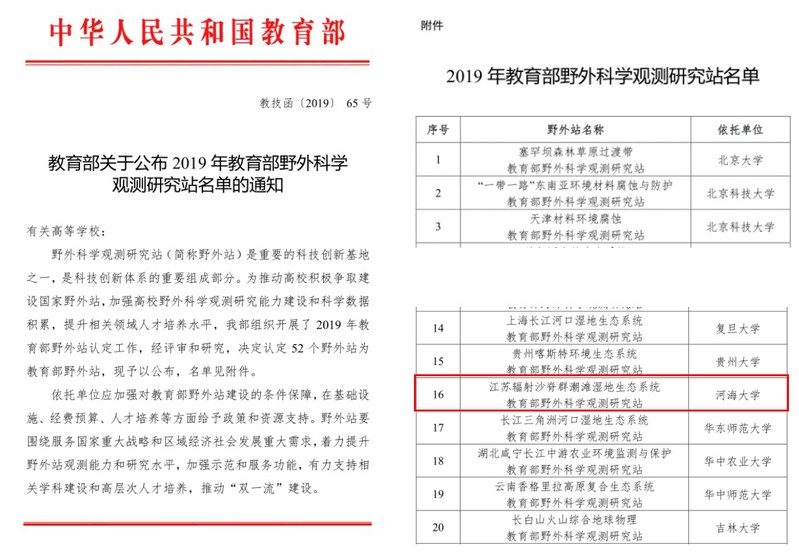 近日,教育部公布了2019年认定的52个教育部野外科学观测研究站名单(教技函[2019]65号),其中我校与自然资源部东海局联合申报的“江苏辐射沙脊群潮滩湿地生态系统教育部野外科学观测研究站”被认定为教育部级,认定日期为2019年8月31日,这标志着我校在滨海湿地研究领域基础科研设施、人才队伍、科研水平等方面迈向了一个新的高度。