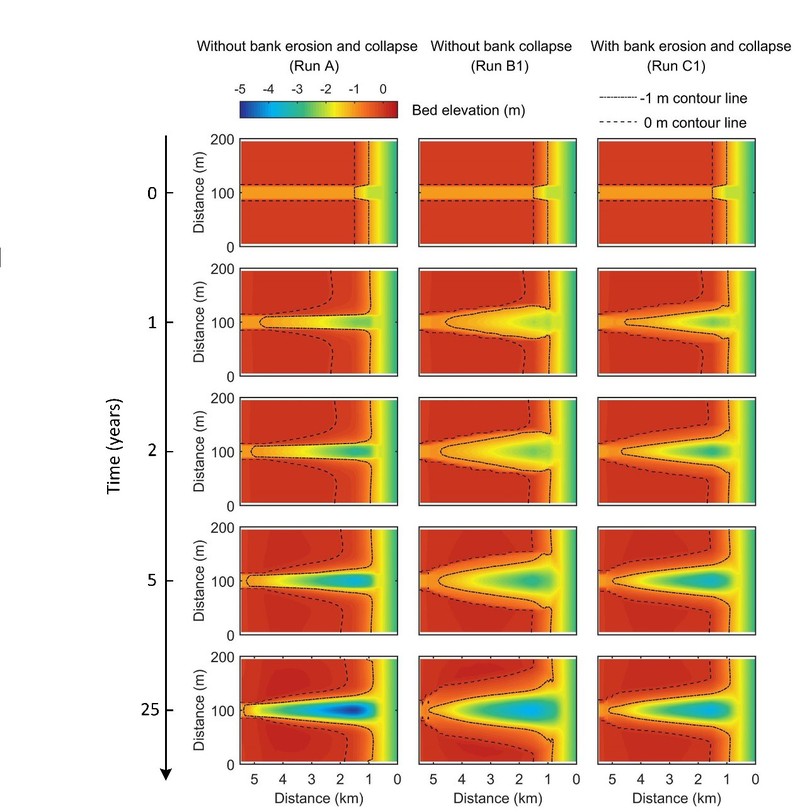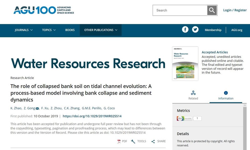 近日,成人漫潮滩动力地貌研究团队博士生赵堃在国际权威期刊《Water Resource Research》(一区Top, 2018年影响因子4.36)上发表了题为“The role of collapsed bank soil on tidal channel evolution: A process-based model involving bank collapse and sediment dynamics”的学术论文,是继该团队在知名刊物《Geomorphology》发表岸壁坍塌对潮沟拓宽贡献研究后的又一突破。论文第一作者为成人漫赵堃博士生,合作作者包括龚政教授、周曾教授、张长宽教授,以及华东师范大学徐凡博士、阿根廷海洋研究所G. M. E. Perillo教授和新西兰奥克兰大学Giovanni Coco副教授。