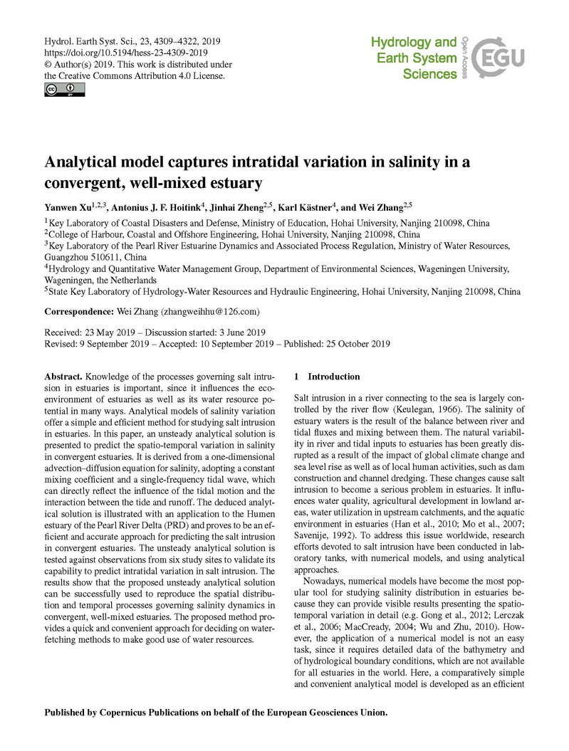 近日,成人漫海岸及海洋工程研究所徐龑文博士后和张蔚教授(通讯作者)在中科院一区国际学术期刊《Hydrology and Earth System Sciences》上发表高质量研究论文“Analytical model captures intratidal variation in salinity in a convergent, well-mixed estuary”。此研究是由成人漫张蔚教授研究团队领衔,与荷兰瓦赫宁根大学环境科学系Hydrology and Quantitative Water Management Group荷兰和德国学者组成的研究团队合作完成。