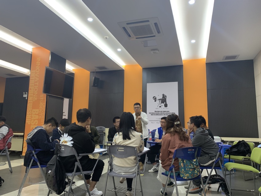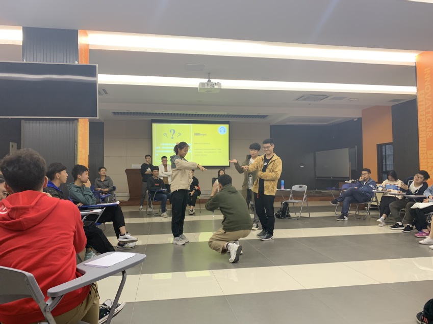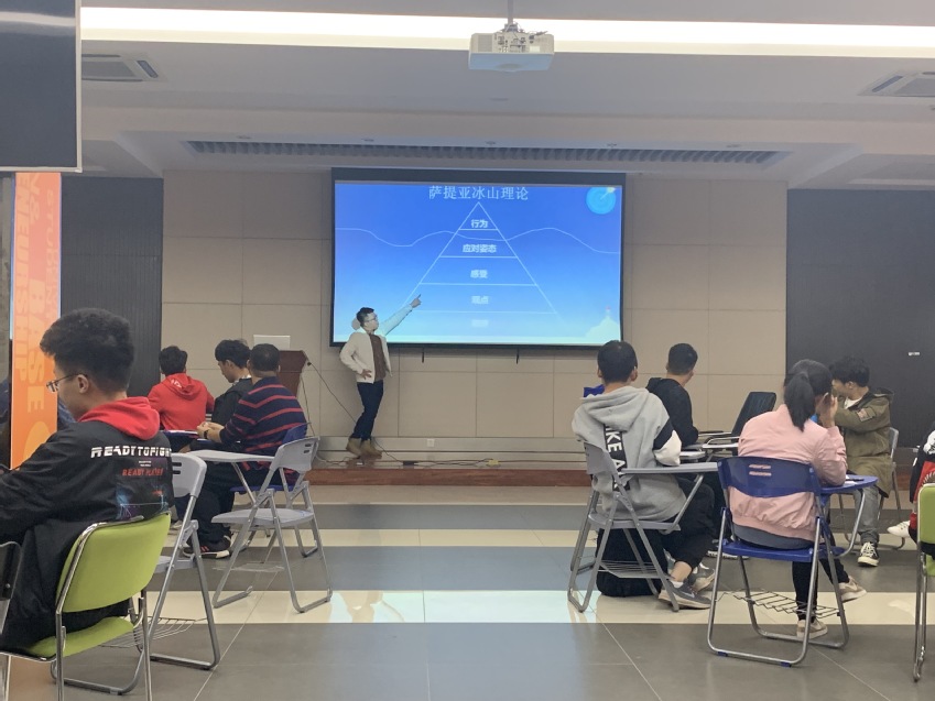 本次活动分为三个环节,第一个环节中,同学们分为四组,每组派出一名同学于赵东伟老师处取得样本图片,在组内描述图片的形状,其他小组成员根据自己的理解将形状绘画在纸上,这个环节让同学们感知到个体间语言表达、思维方式的异同;第二个环节重新分组,打乱为八个小组,赵东伟老师为同学们悉心讲解了人际交往中常用的四种冲突应对模式:讨好、指责、超理智、打岔,以及各种行为模式背后的思维模式、关注点(自我、他人、情境),随后小组抽签,根据指定的动作内容进行无声的情景剧表演,通过肢体语言表达内心,该环节引导学生充分体验各种冲突应对模式带来的心理感受;第三个环节中,同学们重新回归原始组,按照讨好、指责、超理智、打岔四种应对模式,根据萨提亚冰山理论,讨论其背后的感受、观点、期待和渴望,引导同学们形成“表里一致”(即内心期待与外显表达一致)的人际交往习惯。