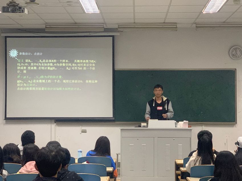 樊煜以三道有关期望和方差的例题为引,讲解了一维和二维两种情况下的习题解法,后带领同学们复习了协方差、相关系数和抽样分布的有关知识和注意点,并帮助同学们多角度、多方法分析了四道相关例题。陈育新例举出了同学们的易错点,即总体矩和样本矩的区别,以分析例题的形式介绍了如何通过矩估计法和极大似然估计法求参数,并在此基础上介绍了估计量的评选标准的解题技巧。