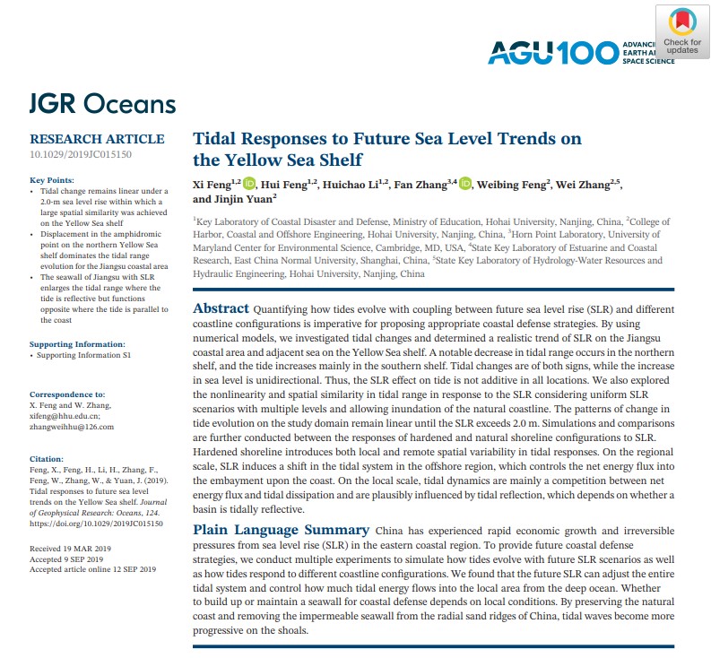 近日,隶属海岸灾害及防护教育部重点实验室(成人漫 ),(Key Laboratory of Coastal Disaster and Defence (Hohai University), Ministry of Education)的冯曦老师携研究生冯辉、李慧超等在国际学术TOP期刊《Journal of Geophysical Research: Oceans》上发表高质量研究论文“Tidal responses to future sea level trends on the Yellow Sea shelf”。该论文阐明了复杂海岸带环境下,海平面上升与潮能演化之间的动态规律,首次界定了在中国特有的开放式海岸条件下,近岸潮能演变规律由线性形态到非线性形态的零界位置。同时,指出了在刚性和柔性护岸不同条件下,黄海大陆架近岸潮能应对海平面上升的自适性。该论文反映了平行岸线的前进潮波与垂直岸线的类驻波潮波与不同护岸之间的组合关系;从运动机制与动力机制两方面分别揭示了柔性护岸与刚性护岸工程对近未来(100年间)潮能发展的状态。该成果不仅具有重要的理论意义,而且对目前我国的生态护岸工程也有广泛的现实借鉴作用。