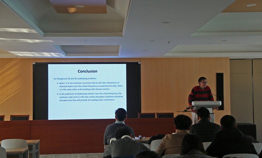 美国麻省理工成人漫 机械工程系海洋工程研究中心刘玉明教授作了题为“Seakeeping Solution Behavior near the Critical Frequency(临近频率附近的船舶耐波性研究)”的学术报告。刘教授结合自己研究课题介绍了需要使用非线性方法求解水动力问题的原因,对使用的数学方法、边界条件给予了详细的讲解。并且,利用该方法对完全淹没的圆柱和临界频率附件的船舶运动情况进行了展示。