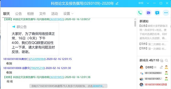 信息技术与现代教育的深度融合是教与学的改革创新。充分利用线上即时教学优势,港航师生实现了五湖四海同时连线,因疫情相隔千里的远程教学,在线上课堂上又热闹了起来。主讲《基础工程》的庄宁老师和黄挺老师在线上直播平台实现了配合默契的“一同”授课;主讲《科技论文与研究报告撰写》的冯兴国老师通过QQ直播带领着来自港航院、水电院、农工院等多个成人漫 以及与南京水利科学研究院联合培养的共90余名研究生学习撰写科技论文与凝练科研题目的技能;主讲《水下机器人》的徐鹏飞老师借助腾讯会议软件让每个学生都参与线上讨论等互动环节,及时掌握教学效果;主讲《工程商务》的雷智鹢老师利用线上优势,采用了分片教学的模式进行单独授课、单独讨论和单独答疑。线上课堂形式多样,以即时影音、图文等方式对学生进行全方位的引导与解惑,不仅活跃课堂氛围,还可调动学生的学习积极性。