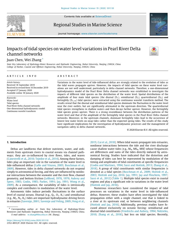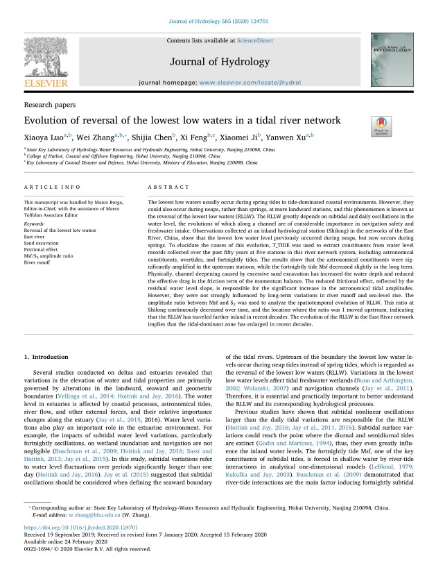 发表在“Journal of Hydrology(2020)”的论文,是近三年内继“Ocean Engineering(2017)”“Journal of Hydrology(2018)”,“Hydrology and Earth System Sciences(2019)”,“Water Resources Research(2019)”,“Journal of Geophysical Research -Oceans (2019)”和“Coastal Engineering(2020)”, 张蔚教授课题组围绕着河口三角洲潮波运动理论发表的第七篇一区论文。