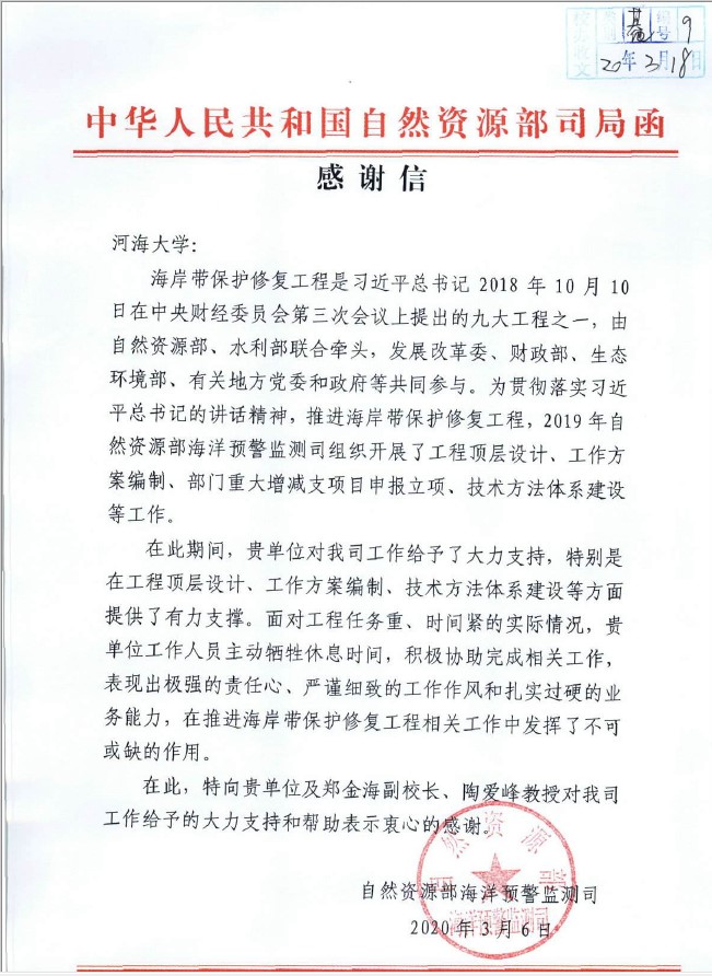 近日,自然资源部海洋预警监测司给我校发来感谢信,对成人漫郑金海教授和陶爱峰教授等多位教师在推进海岸带保护修复工程中的有关工作表示衷心的感谢。