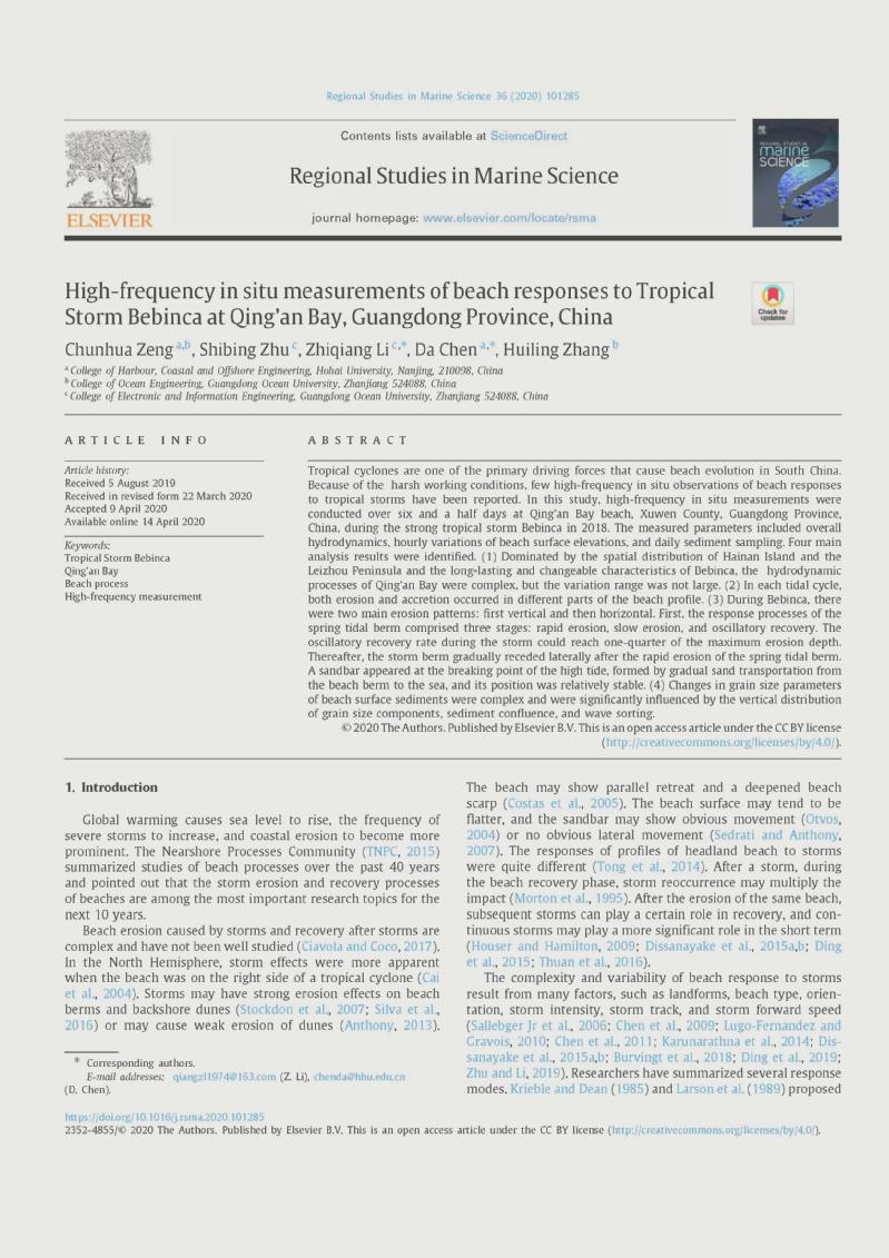 近日,成人漫陈达教授指导的博士研究生曾春华在《Regional Studies in Marine Science》(二区)上发表了题为“High-frequency in situ measurements of beach responses to Tropical Storm Bebinca at Qing’an Bay, Guangdong Province, China”的学术论文。