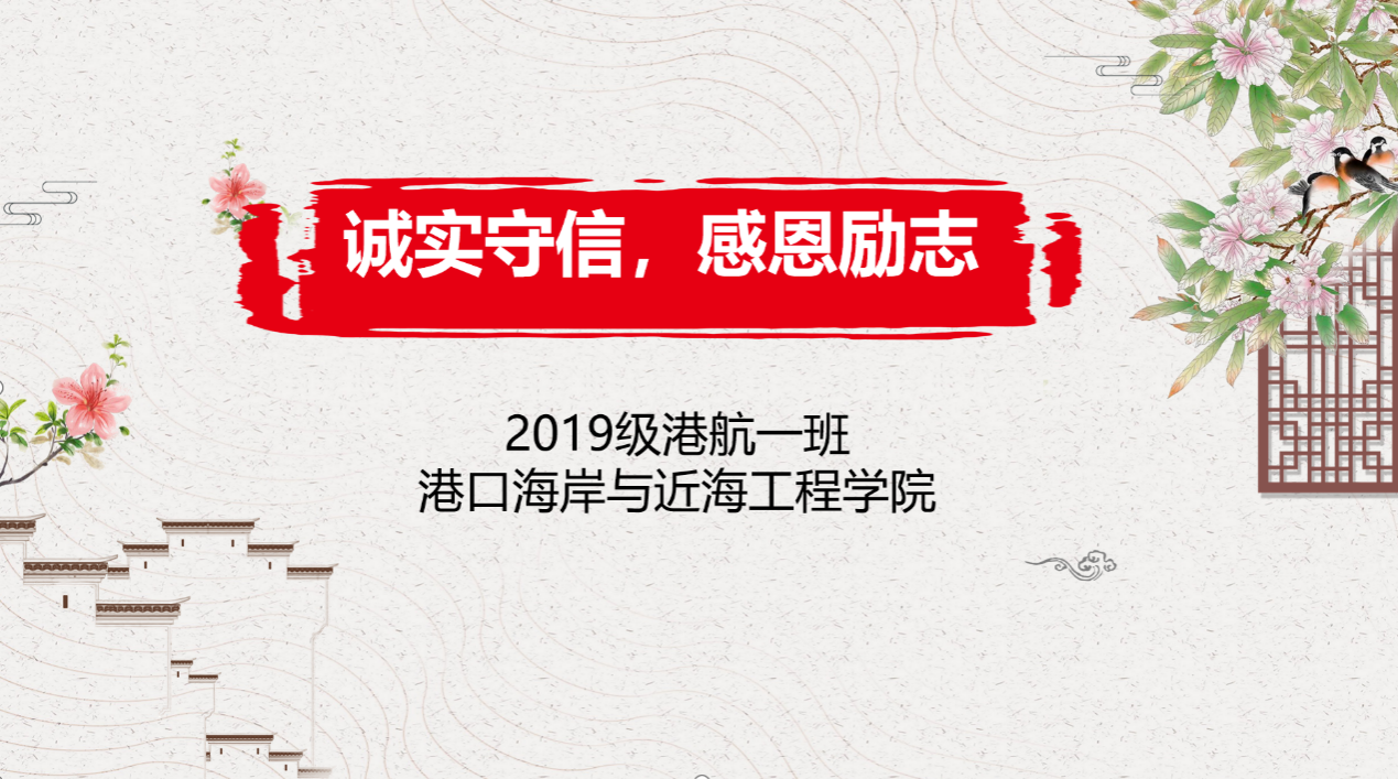 2020年6月,为迎接学校第八届“诚信·励志·感恩”主题教育月活动,港航院组织本科生在线上开展“诚实守信,感恩励志”主题班会。