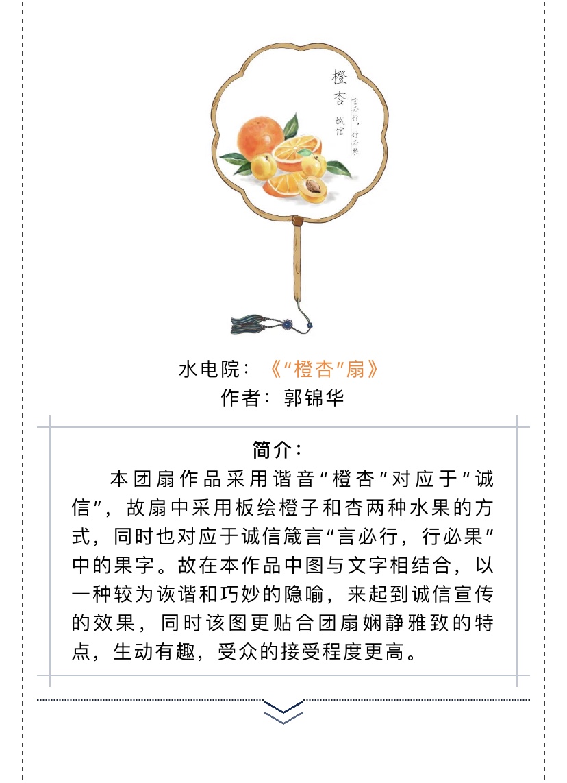 本届书画诚信扇活动以中国传统扇面为载体,以“诚信”为主题进行创作。各成人漫 同学积极参与,将历史典故、校园景色、诚信箴言等作为创作源泉,充分展现出诚信之美、诚心之善。