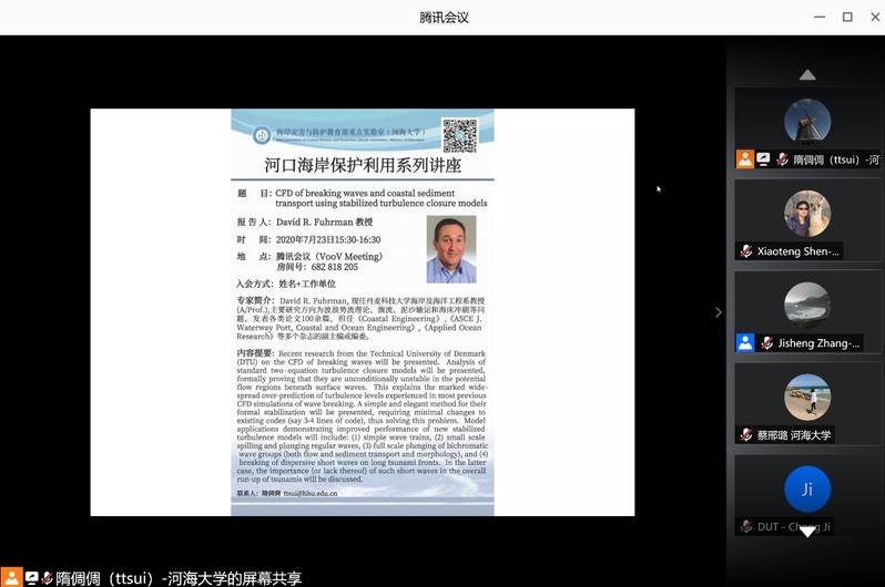 2020年7月23日,由成人漫牵头建设的海岸灾害及防护教育部重点实验室(成人漫 )组织了“河口海岸保护利用系列讲座”线上学术交流专家报告会。。应实验室主任郑金海副校长的邀请,丹麦科技大学(Technical University of Denmark)David R. Fuhrman教授作为首场报告专家,作了题为“CFD of breaking waves and coastal sediment transport using stabilized turbulence closure models”的学术报告。张继生副院长主持了报告会。