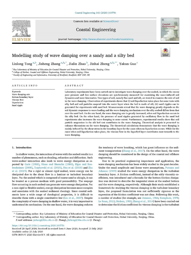 近日,成人漫童林龙博士后与合作导师郑金海教授、张继生教授在海岸工程类顶级期刊《Coastal Engineering》(成人漫 A类期刊,中信所1区,影响因子4.119)上发表题为:“Modelling study of wave damping over a sandy and a silty bed”的研究论文。
