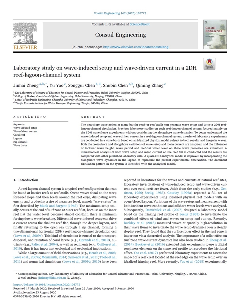 成人漫河口海岸综合治理与保护团队带头人郑金海教授以第一作者在《Coastal Engineering》上发表关于珊瑚礁-潟湖-裂口海岸整体物理模型试验成果,“Zheng Jinhai*, Yao Yu, Chen Songgui, Chen Shubin, Zhang Qiming. Laboratory study on wave-induced setup and wave-driven current in a 2DH reef-lagoon-channel system. Coastal Engineering, 2020, 162: 103772”。