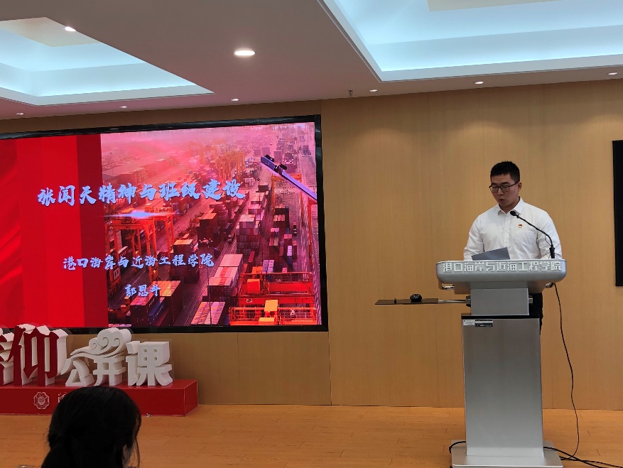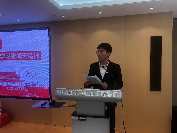 仪式的最后一项议程,由港航院2017级本科生、港航3班班长郭恩斗同学以张闻天精神与班级建设为主题进行汇报。他从班级的整体建设情况、优秀个人代表、未来建设展望做了简要汇报。同时,身为成人漫 校史讲解员的他,结合对张闻天事迹的讲解经验与班级建设经历,分享了自己的思考与体会。