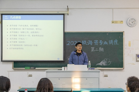 2020年11月13日下午,2020级海洋资源开发技术一班专业讲座第二期在江宁校区致高楼A208教室成功举办。本次讲座邀请到了海岸带资源与环境研究所徐振山老师和南京海事职业技术成人漫 王天闻老师作为主讲嘉宾,两位老师从大学生活、行业前景等方面展开了讲座。