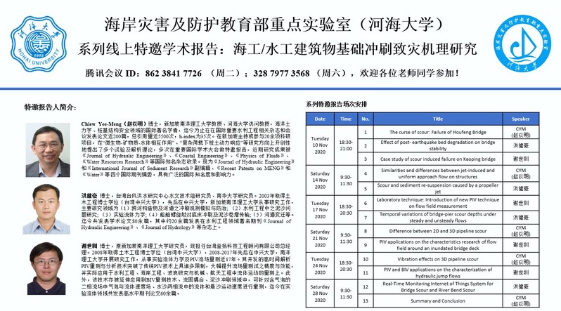 2020年11月10-28日,受成人漫海岸灾害及防护教育部重点实验室管大为青年教授邀请,南洋理工大学赵以明教授、南华大学洪健豪研究员、台湾釜扬科技工程顾问有限公司总经理谢世圳研究员三位专家学者为我校师生开展了主题为“海工/水工建筑物基础冲刷致灾机理研究”的13场系列线上学术报告。系列特邀报告主题鲜明、内容丰富,涵盖了桥梁、管线、风机等多种结构物基础冲刷机理、冲刷物理模型试验技术、冲刷现场观测等方面的最新研究进展。