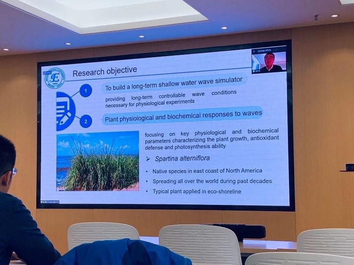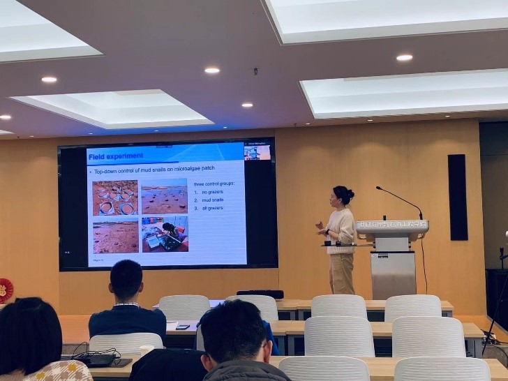 邵冬冬副教授在题为“Coastal Eco- and Environmental Hydraulics:Some (Interdisciplinary) Attempts”的学术报告中,开展了三个主题的探讨:影响植物消亡的波浪胁迫作用、植物种子长距离繁衍机制和渔网对流体力学的影响。张荷悦博士作了题为“Grazer movement affects the resilience of patterned ecosystem“的学术报告,介绍了植食动物影响下的斑图生态系统恢复力研究。
